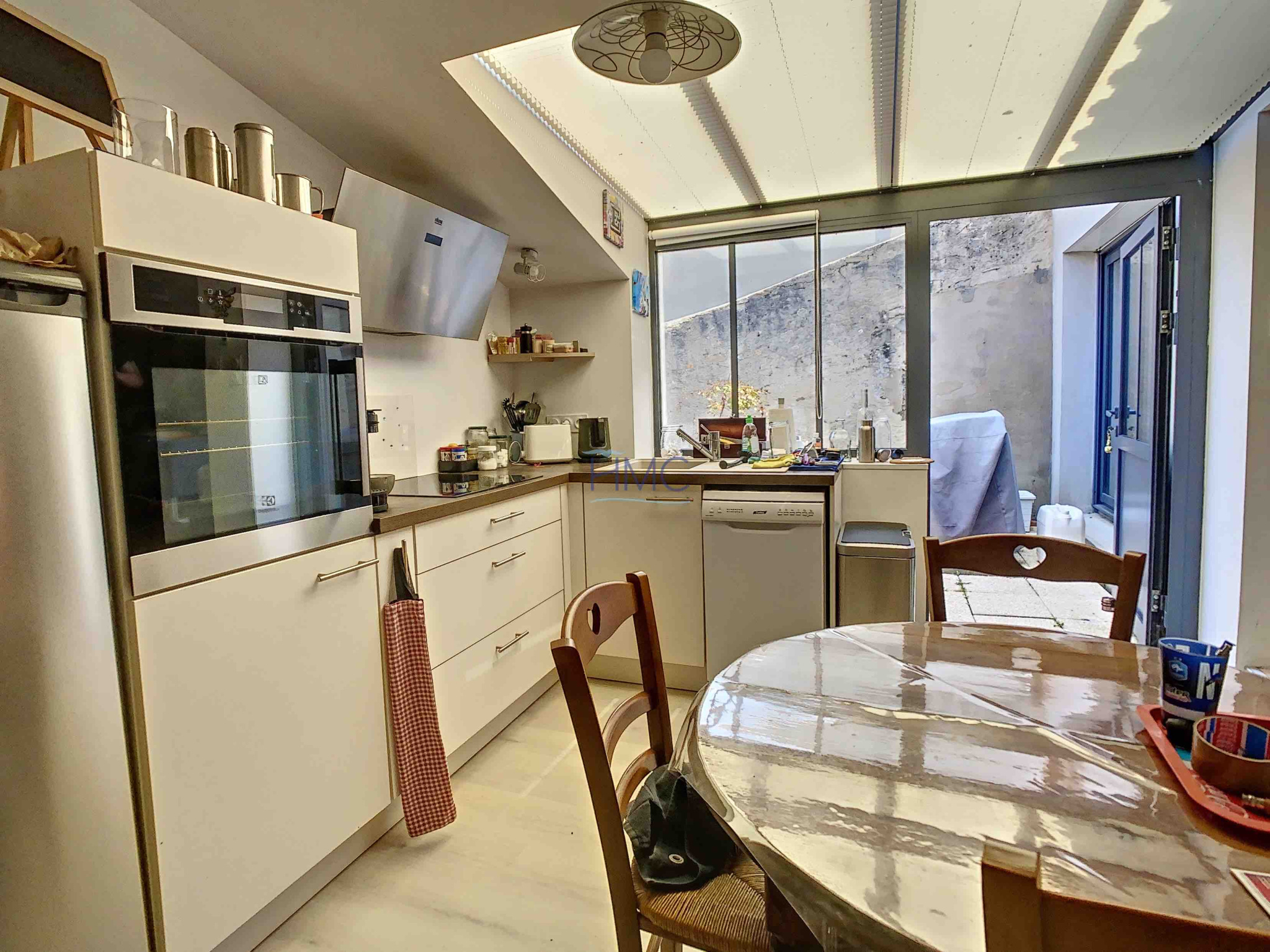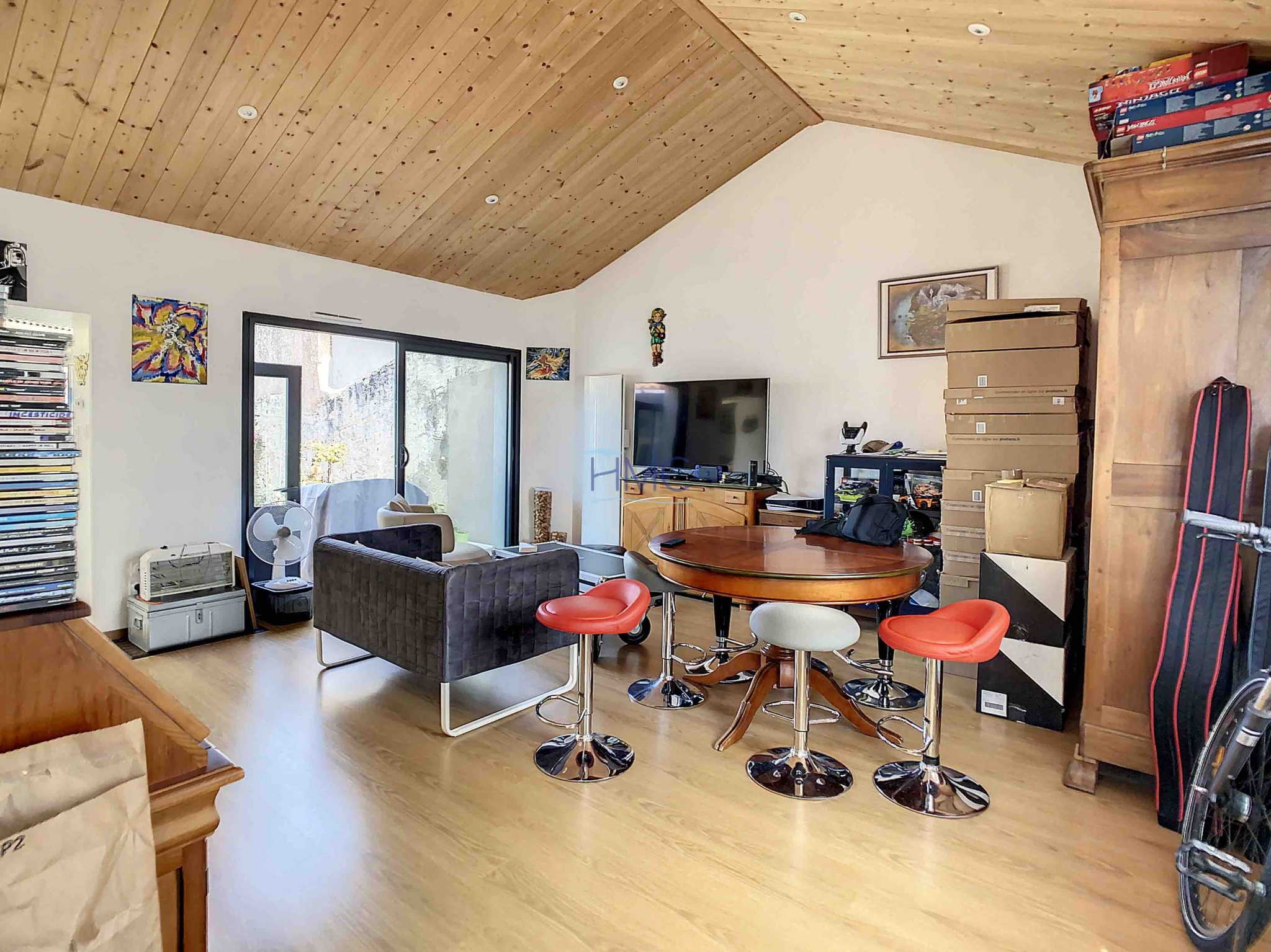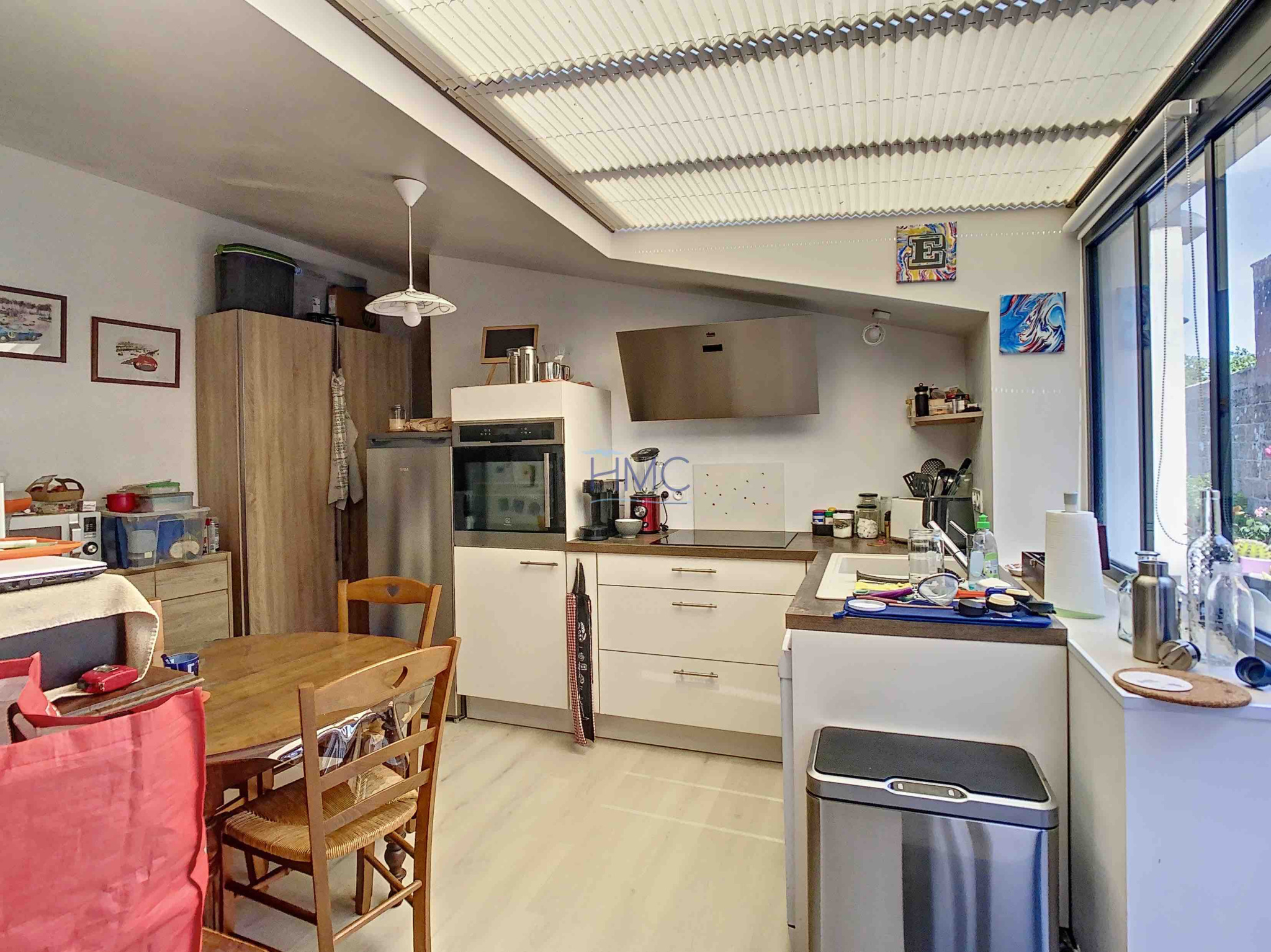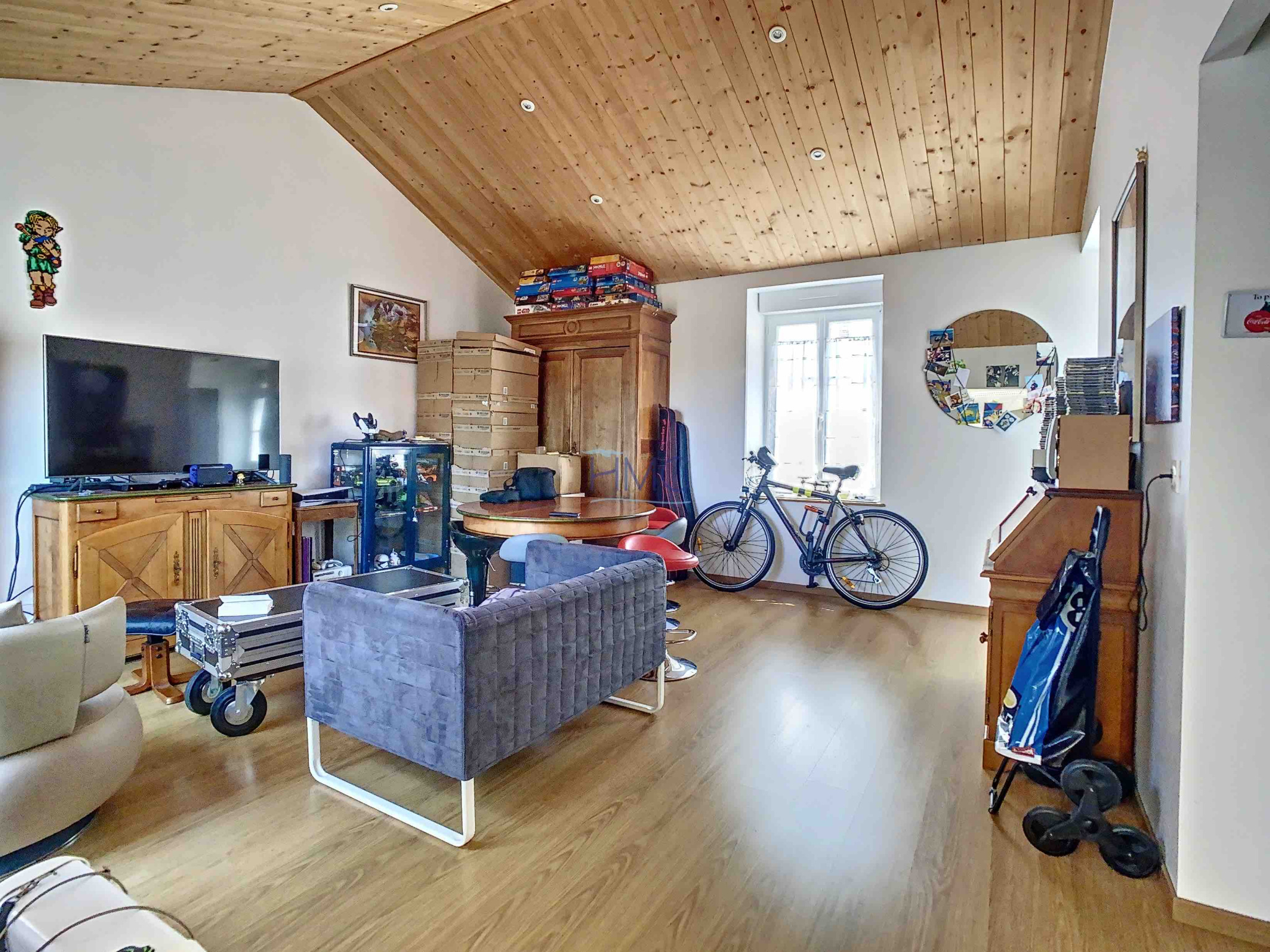 Jolie salon-séjour avec plafonds rampants, cuisine aménagée (sous verrière), 3 chambres, 2 salles d’eau, 2 wc.